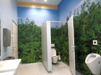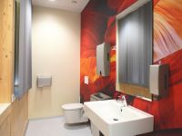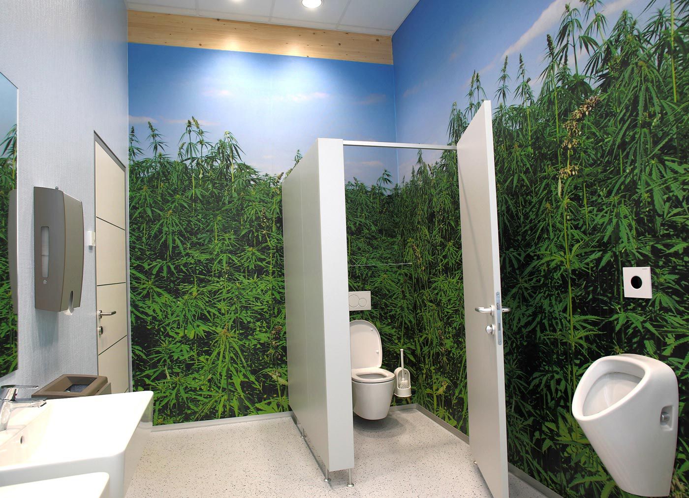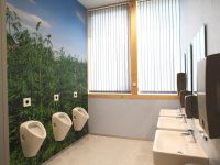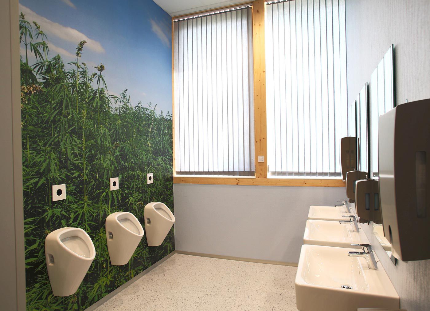 Das Synthesa-Elefantensymbol als PhotoVision auf der Außenfassade und die großflächige PhotoVision-"Willkommenswand" im Foyer des Komplexes empfangen herzlich Besucher aus aller Herren Länder. Die Technik ziert auch den Eingang zum "Kreativstockwerk" mit den Büroräumlichkeiten des FarbDesign-Studios. Und in den Sanitärräumen setzt Synthesa in der neuen Arena ebenfalls auf hygienische, photorealistische Applikationen anstelle von Fliesen.