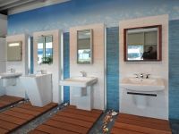 In eine erfrischende Meeresbrandung tauchen Besucher des Schauraums bei der Besichtigung der Waschbecken ein: Eine kombinierte Wand-Boden-Gestaltung (Bodenbild.com) verzaubert den Nassbereich und entführt in andere Welten.