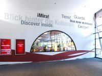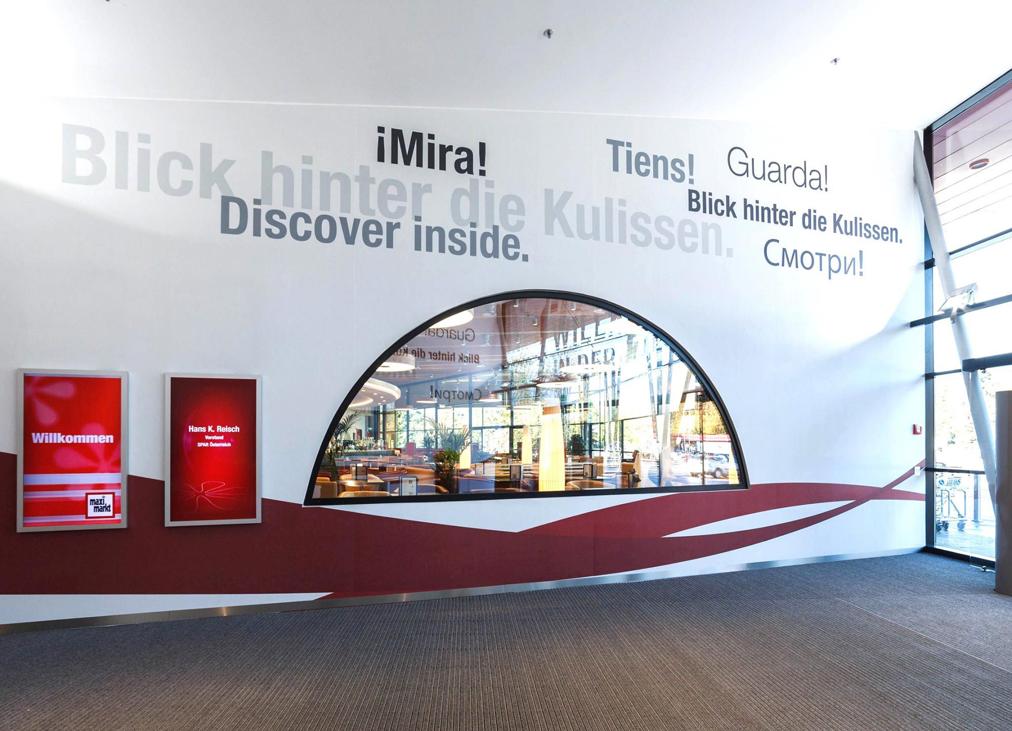 Verschiedenste Generationen und Kultu-ren bewegen sich vergnügt unter dem schützenden Baldachin des Maximarkt Daches und fühlen damit eine große Zugehörigkeit zur Maximarkt Familie. Der rote Faden entwickelt eine magische Sogwirkung und leitet den Besucher vom Außenbereich in die "heiligen Hallen" des Shoppingtempels.