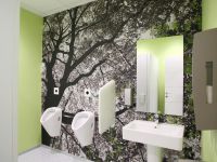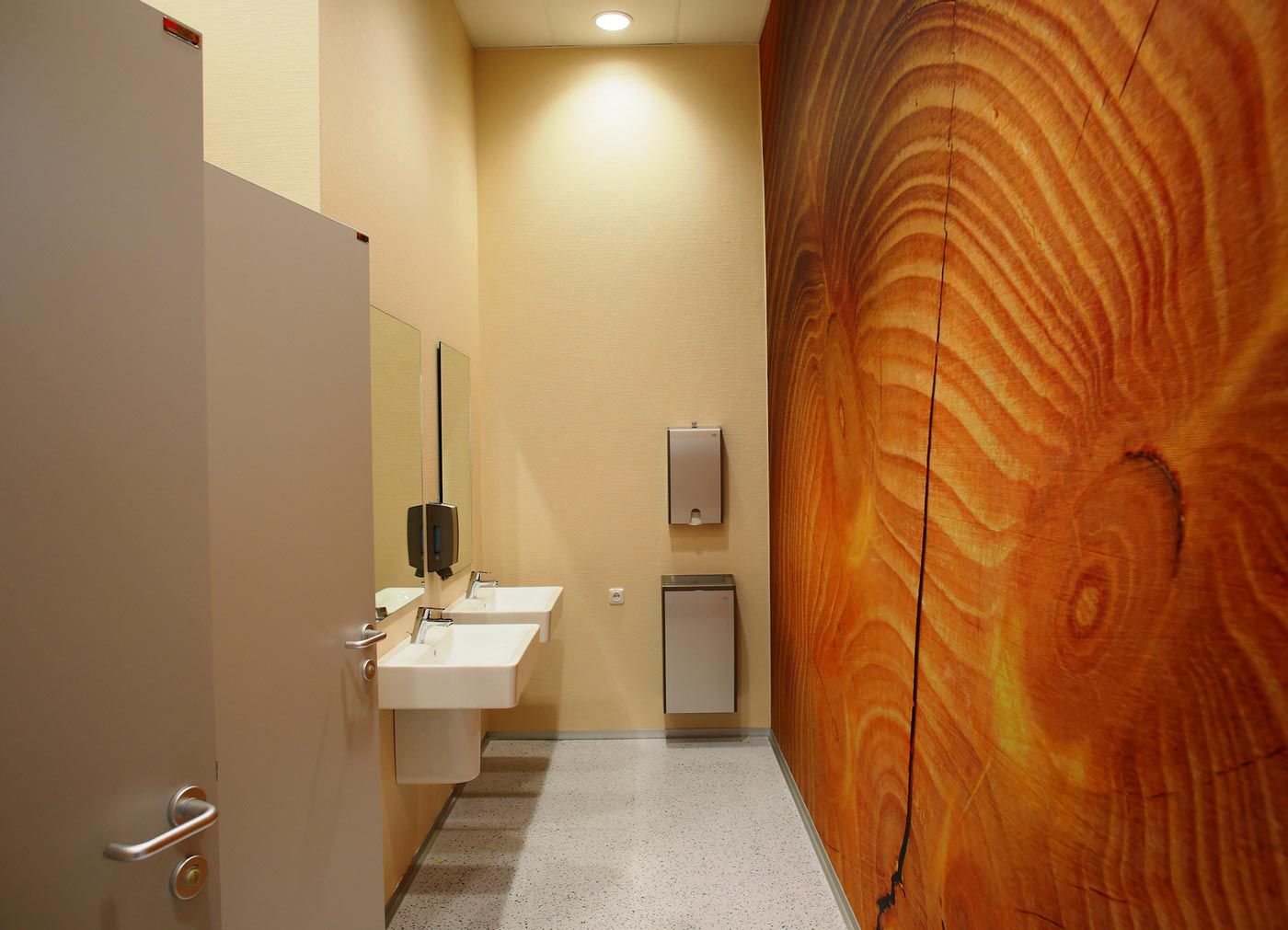 Das Synthesa-Elefantensymbol als PhotoVision auf der Außenfassade und die großflächige PhotoVision-"Willkommenswand" im Foyer des Komplexes empfangen herzlich Besucher aus aller Herren Länder. Die Technik ziert auch den Eingang zum "Kreativstockwerk" mit den Büroräumlichkeiten des FarbDesign-Studios. Und in den Sanitärräumen setzt Synthesa in der neuen Arena ebenfalls auf hygienische, photorealistische Applikationen anstelle von Fliesen.