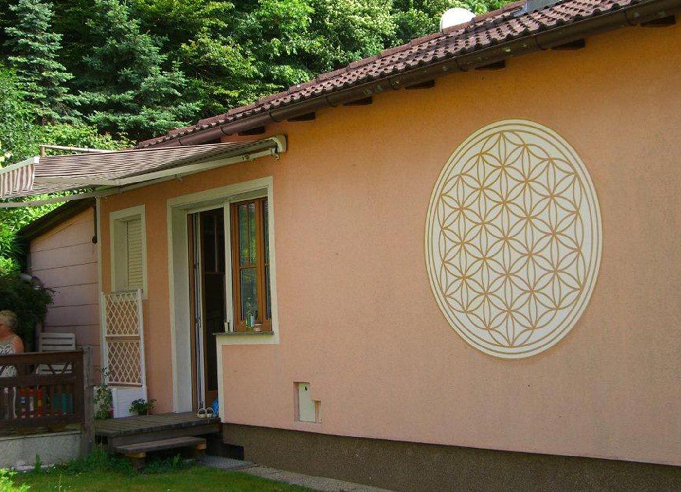 Ob in Goldoptik, Silber oder angepasst an eine beliebige Wunschfarbe, die Blume des Lebens als ganz persönlicher Hausschmuck versprüht ihre symbolische Kraft gleichermaßen auf Bewohner wie Besucher. Ein gern gewähltes KrARTiv-Motiv für das eigene Zuhause!