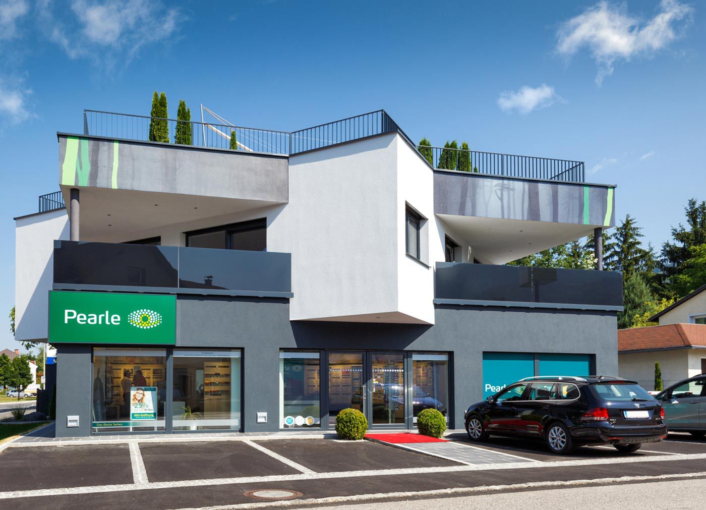 Die beste Startposition bietet das mondäne Gebäude auch für Pearle Optik, die sich das gesamte Erdgeschoss als Heimat für ihren neuen Standort in Kirchdorf/Krems gesichert hat.