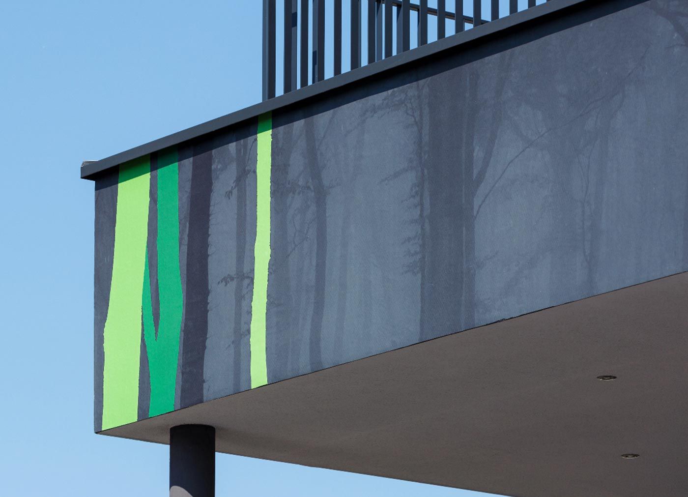 Die Oberschicht der Gebäudefassade ziert ein mit der von Ewald Ploner patentierten Fassadenbild-Technik umgesetztes Motiv des Art+Graphic-Designers Chris Rosenberger. „Die Wald-Szenerie haben wir in Erinnerung an das vor rund 50 Jahren hier existierende Bauernhaus „Edlbauer“ mit eigenem Nussbaum gewählt“, so der Gebäudevermieter Ewald Ploner. Das stimmungsvolle Außentapetendesign harmoniert mit der innovativen Architektur und schafft ein fesselndes optisches Gesamtkonzept.